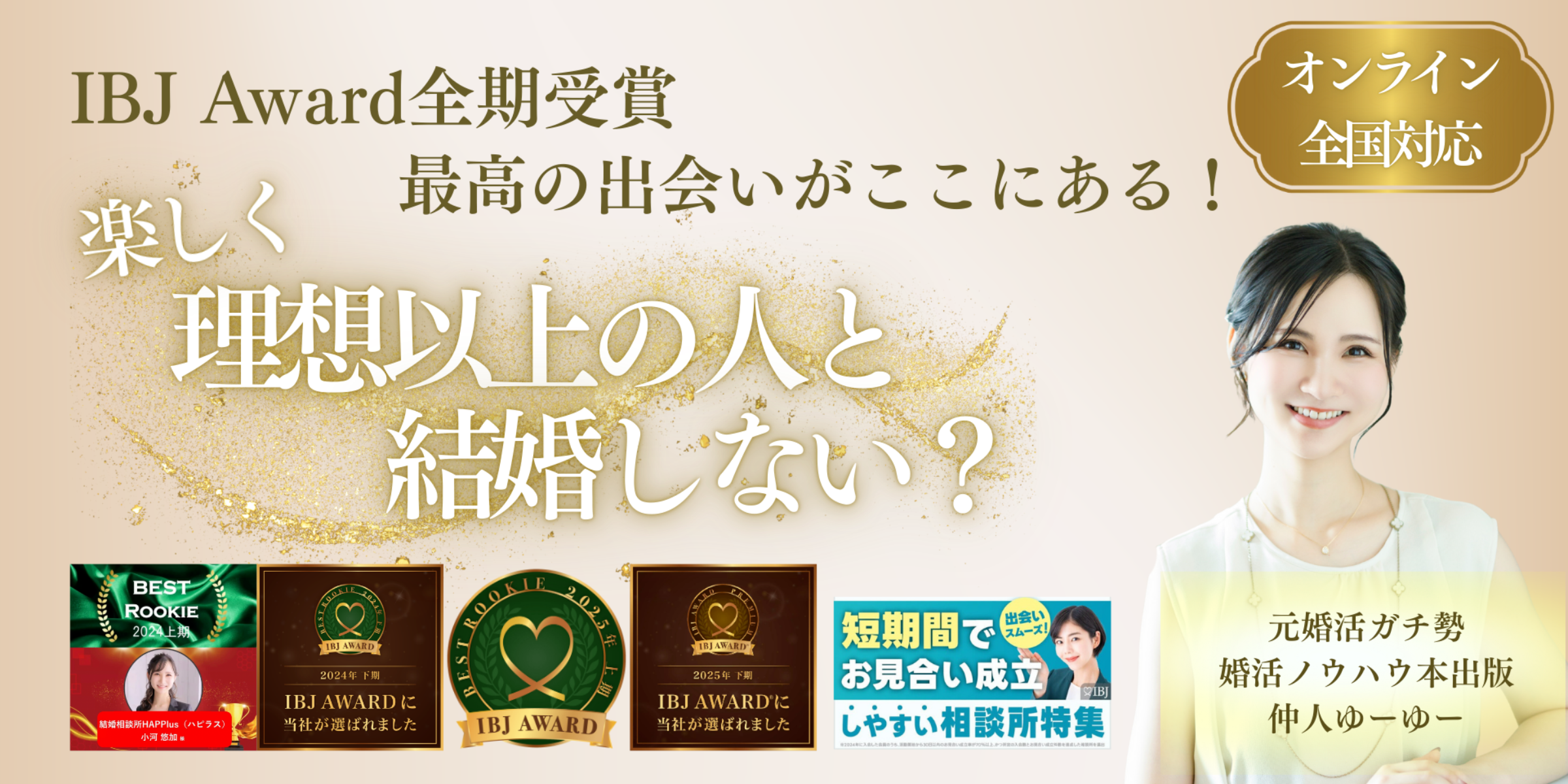 HAPPlusは業界唯一の東証プライム上場企業(IBJ)に加盟し、出会いの数だけでなく、質にもこだわりたい方に適しています。またIBJでの婚活経験があり、結婚している夫婦が運営しています。(再婚、子育て経験もありますので再婚者、シングルマザーの方にも寄り添ったアドバイスが可能です。)